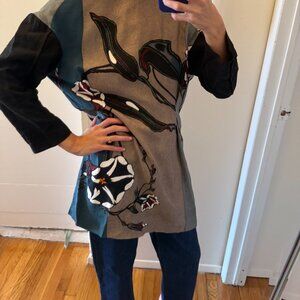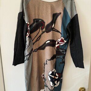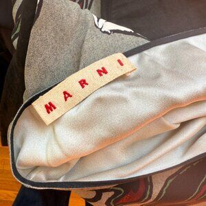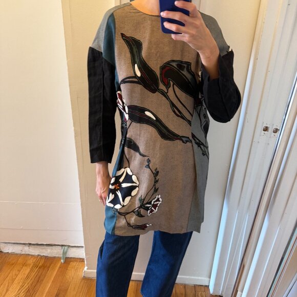 Really beautiful Marni dress made in a printed floral pattern on viscose fabric, with black linen fabric for the sleeves. The fabric feels really nice. Listed size 42, fits like a large. I am a small and it was oversized on me. Can be worn as a dress or as a tunic with pants.