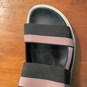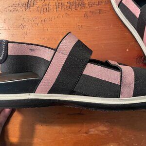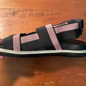 Marni Fussbett slingback sandals in pink and black nylon. They're stretchy and very easy to slip on and off.