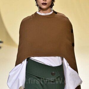 Marni Muted Dark Blue Double Wool Short Cape Poncho size IT 42 US 6, visible pilling throughout--e.g. last pic could be removed, made in Italy, model MNMAU11A00TW554 commessa 0000293942, crew neck, four snap button opening down left shoulder, shorter length, straight hem behind, shorter and curves up in front, dark blue woven self, fall winter 2016 -- see runway pics for different colorway/length, 100% virgin wool, ~17" across shoulders, 0" shoulder to hem, ~22.5" 'sleeve,' 23.5" middle back to hem, 14" middle front to hem