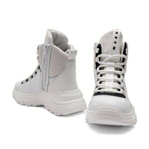 Step up your footwear game with the Marni White High-Top Leather Lace-Up Sneakers, a perfect blend of modern design and everyday functionality. Crafted from premium leather, these sneakers feature a sleek white silhouette accented with bold black details for a contemporary edge. The high-top design provides superior ankle support, while the cushioned sole ensures all-day comfort. Finished with signature Marni branding on the tongue and durable laces, these sneakers are ideal for casual outings, urban adventures, or adding a touch of sophistication to any outfit.