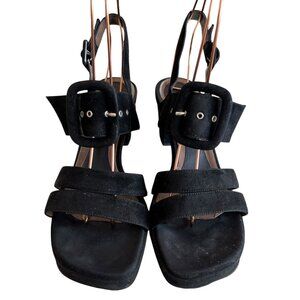 Marni high heel sandals, black suede, square toe, buckles and grommets, platform, chunky 2.75" high heel, leather lining and soles, IT 40 / US 10, preowned and shows wear on the soles, scuffs/fading on the suede, worn toe tips, small gap at the midsole which may need repair in the future - see photos