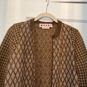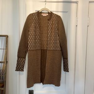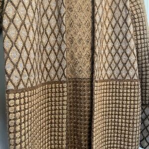 Cool geometric patterns in brown & gold hues. Medium/thick knit fabric. 100% wool.