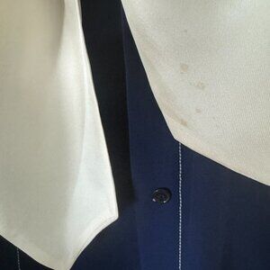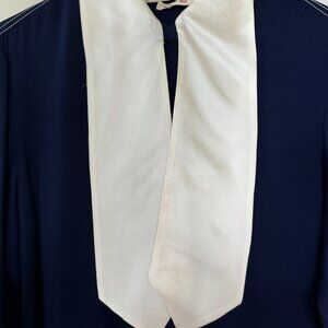 Blue and ivory Marni top with tie accent at neckline, long sleeves, contrast stitching throughout and button closures at front.