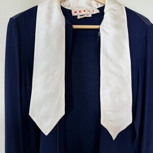 Elegant Marni blouse worn twice, this is a size IT 40. I wear a Medium and felt it fit me perfectly, though it likely is supposed to be more oversized. There are two slight spots on the underside of the tie (shown in photo). Not noticable when wearing because they are on the underside, other than that it is in pristine condition.