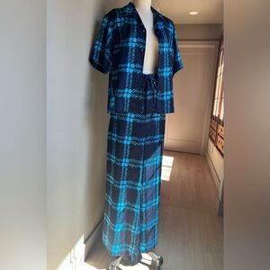 Thick silky satin with a boxy easy fit and delicate collar detailing. Blue plaid print, size small.