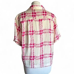 Additional Details: Short sleeve, open collar design Soft, lightweight silky satin fabric Chic pink and cream colorway Perfect for casual, work, or layering 📏 Measurements (approx.): Bust: 21½" / Length: 24"