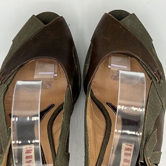 Marni Green Canvas & Brown Leather Peep Toe Slingback Platform Heels EU 40 US 10