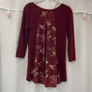 Maroon 3/4 length sleeve shirt. Light, soft material. Back flower detailing is sheer and flowy!
