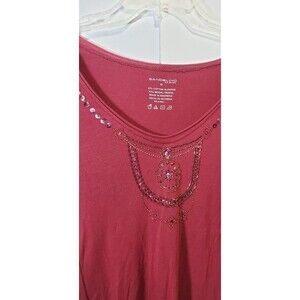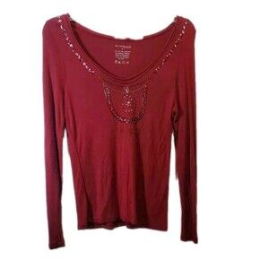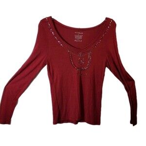 Add a touch of sparkle to your wardrobe with this womens small maroon long-sleeved top, featuring elegant beadwork across the front. The rich burgundy hue and luxurious embellishment make it perfect for holiday gatherings, evening events, or adding a boho-inspired accent to everyday wear. The flawa minor imperfection in the beadwork or fabricdoes not affect wear or overall appearance, ensuring this piece remains stylish yet affordable. Soft and comfortable with full length sleeves, this top flatters petite figures and pairs beautifully with high-waisted jeans, skirts, or layered under jackets for a Y2K or whimsical goth vibe. Embrace the unique character of vintage fashion with this budget-friendly findideal for those who love sustainable style and creative layering. Style tip: add statement earrings or a velvet hairband to complete the look. Please review photos for details of the flawsold as described.