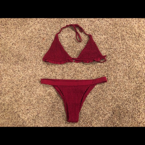 smocked maroon bikini from Zaful. Never worn before because it does not fit me:( super cute I just need a bigger size. Bottoms are medium coverage. 3rd picture is the clasp in the back! Size large but I would say it fits more like a medium; could even fit a small