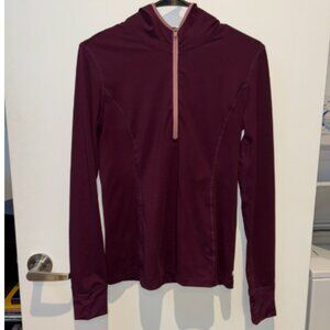 Fabletics maroon acket with pink piping, a hood, and multiple pockets.