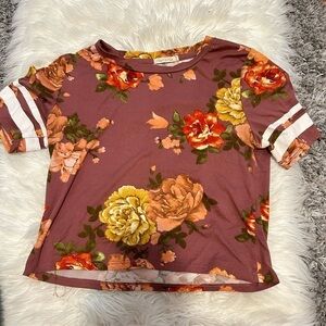 This maroon floral crop top is a versatile addition to any wardrobe. The vibrant floral print adds a touch of femininity, while the cropped length offers a modern and trendy look. The soft, stretchy fabric ensures comfort, and the short sleeves with white stripes add a sporty touch. Perfect for pairing with high-waisted jeans, skirts, or shorts, this top can be dressed up or down for any occasion.