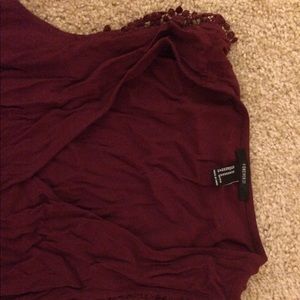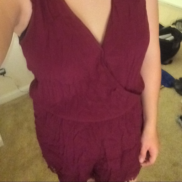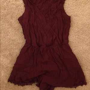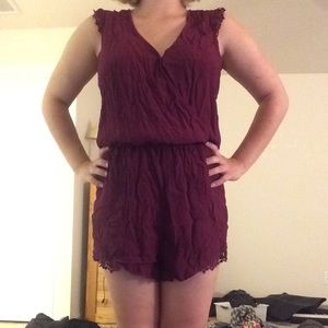 This gorgeous maroon romper from Forever 21 is a staple piece for a summer, or fall wardrobe! It has adorable lace detailing on the sleeves and bottom of it. It's from forever 21, and it's a size medium. It runs true to size, has an elastic band hidden in the waistband, as well as a button snap closure on the chest. It's been worn 3-4 times and will be washed and ironed before shipping.