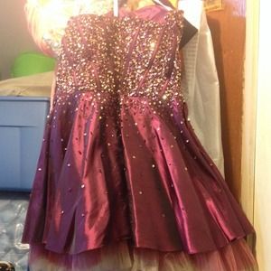 WILL DO TRADES FOR MAC MAKEUP Short cocktail dress, embedded with maroon and gold sequins. Maroon and gold tule undereath and maroon bodist. Strapless