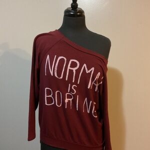 Maroon sweatshirt with 'Normal is Boring' graphic text. Casual and stylish.