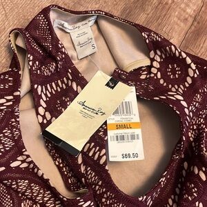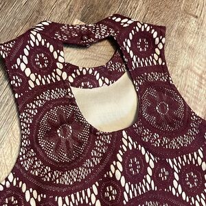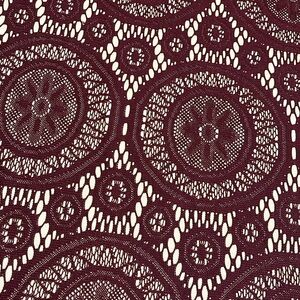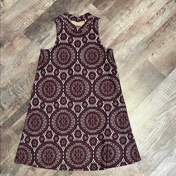 Chic burgundy/maroon dress with unique circular patterns. Perfect for casual outings. Comfortable and stylish. High neckline