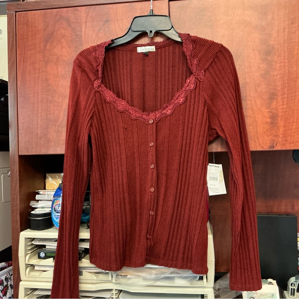 Stylish maroon ribbed cardigan with button-up front and lace trim. Perfect for layering.