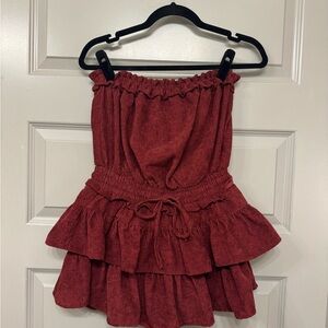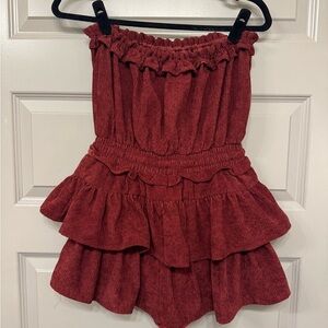 Stylish maroon strapless romper with ruffled details. Perfect for a chic game day look.