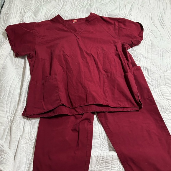 This maroon colored medical scrubs set features a short-sleeved V-neck top (Dickies size 2X) and elastic waistband pants (off brand size L) designed for ease of movement. Made from a lightweight and durable material, these scrubs are practical for everyday use in healthcare settings.