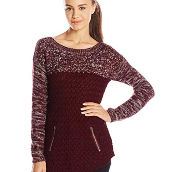 The sleeves/shoulders/upper chest are a maroon+white heathered pattern, in a normal knitted texture.
