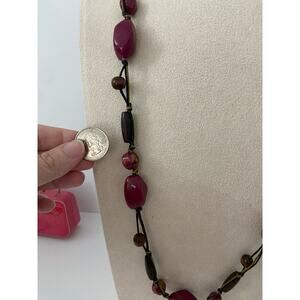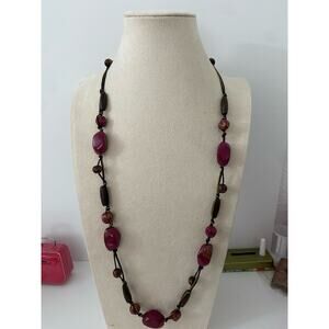 Stylish retro 90s style long cord necklace with maroon acrylic and wood beads in good condition may need cleaning great for holidays going out parties vacation affordable bridal boho retro glam cottage