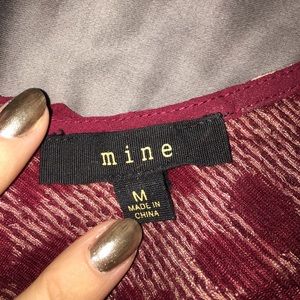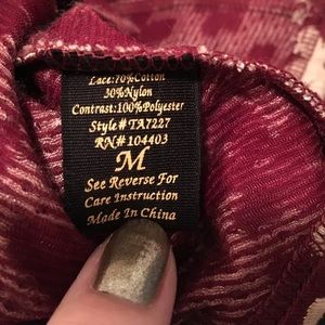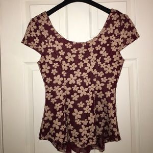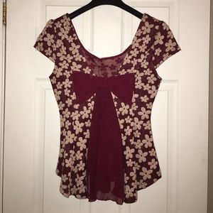 Maroon and cream flowered shirt with bow and shear flowing back. Very cute and soft!