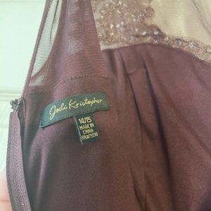 Beautiful dress only worn once. Stored in enclosed dress bag. Top of dress is fitted with loads of gold accents on top of the deep maroon color. Bottom of dress has fun flowing overlay. Ribbon belt fully attached to dress. Size 14/15, daughter wears size large shirts and size 12 pants for size reference. Prices well below value.