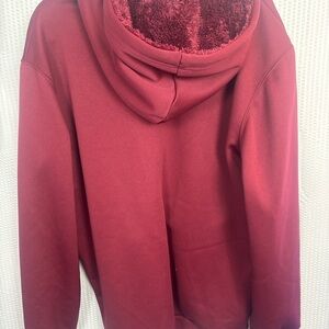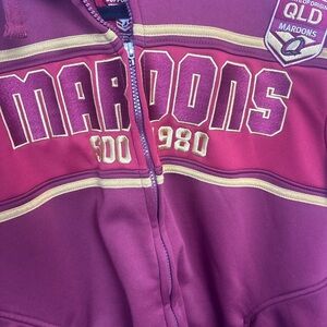Official licensed QLD Rugby League product. Deep maroon color with gold and red embroidered “Maroons” text and QLD team crest patch on chest. Full zip front, drawstring hood, cozy faux fur sherpa lining in hood, and front pouch pockets. Made from a warm, soft material perfect for chilly game days or casual wear.