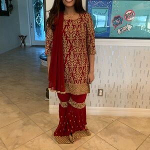 Stunning red traditional outfit with intricate gold embroidery. Perfect for special occasions. Conformable and light while looking heavy (but no heavy beading weighing you down). 9-13 months baby outfit. Baby pictured is 13 months and fits in it well. baby pant legth is 15.5in and baby kurta length is 13 in. womens outfit length are pictured. Woman pictures is 5’4 and not wearing heels so it is a bit long for me. Can easily accommodate 2 inch heels.