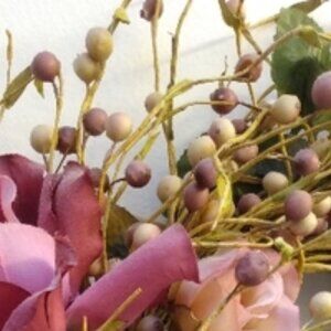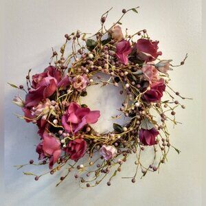 Grapevine wreath base with pink and shades of maroon silk roses and buds and artificial berries.