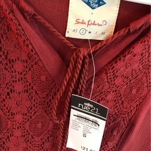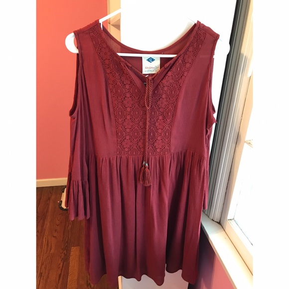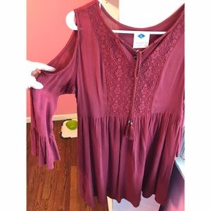 Beautiful maroon dress with tassels on the front. Size small, fits to size. Shoulders are cut out for that stylish look. Never worn before but small rip under the left elbow of the dress (last pic) . It's along the seam so it can easily be sewed!