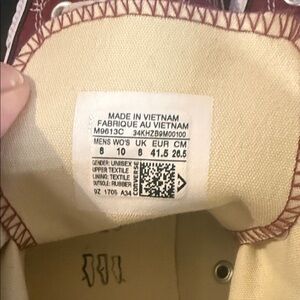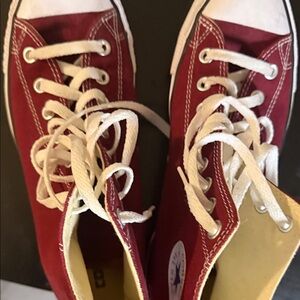 Burgundy high-top Converse sneakers with classic white accents. Iconic style for everyday wear. Men’s 8/Womens 10