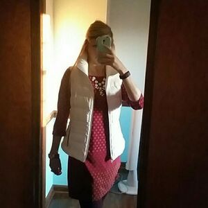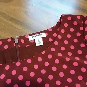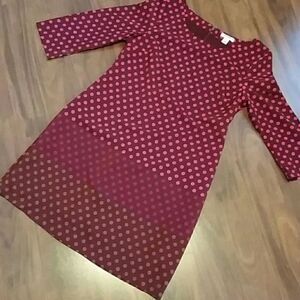 Cute dress. 3/4 sleeve. 100% polyester. Measures 33.5 inches long and 17 inches arm pit to arm pit. I normally wear size small and it fits me.