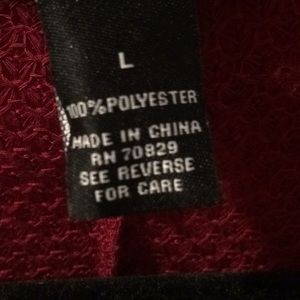 Maroon/red cardigan.