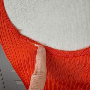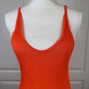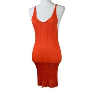 Marques Almeida Orange Viscose Tank Dress Ribbed Stretchy Side Slits Size Small. Great condition with the exception of a repair needed on back trim as shown. Priced accordingly. See photos for details and unstretched measurements. View my closet to add other items and bundle to save with one shipping fee!