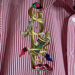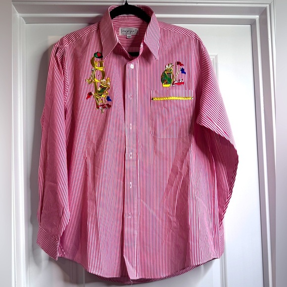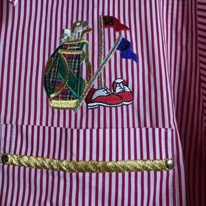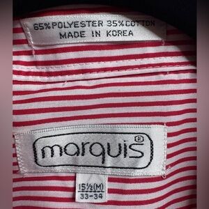🆕Marquis Red White Stripe Vintage Mens Golf Oxford Button Down Collared Shirt Size 15 1/2 in excellent condition. While it is listed for a man, it would fit a woman sized medium or large beautifully. See the measurements.