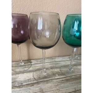 Bring a touch of playful elegance to your table with this beautiful set of 4 Marquis by Waterford wine glasses. Each glass features a bold balloon shape with a frosted polka dot design and comes in a unique jewel-tone color — smoky gray, plum purple, teal green, and aqua blue.
