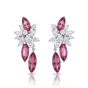 Radiant and refined, these earrings are masterfully crafted in 18K white gold, showcasing the fiery elegance of marquise-cut rubies and the brilliance of round and marquise-cut diamonds. Each earring is designed in a floral cluster motif, with diamonds encircling vivid rubies, while a suspended ruby drop adds graceful movement. The rich red hue of the rubies contrasts beautifully with the icy sparkle of the diamonds, creating a captivating balance of passion and purity.