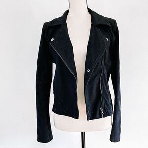 The contrast between a sweet shift dress or lovely lace blouse and a tough motorcycle jacket is always effortlessly on trend. This jacket takes the comfort up a notch with the thick cotton material giving you the look of the classic leather jacket with the comfort of your most worn in sweater.