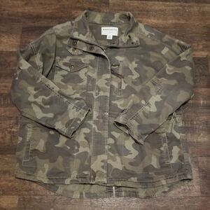 In excellent, gently owned condition. Full zipper closure. Drawstring waist and hem. Utility style pockets. 6" slit at back. Approximate measurements laying flat: 23" from armpit to armpit, 24.5" across the shoulder, 16" from shoulder to cuff, 22" from top of shoulder to front hem, 25" from top of shoulder to back hem.