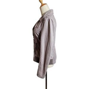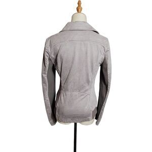 My jacket is gray. First pic is to show modeled. This jacket reminded me of Free People. It has sort of a casual boho look. Material is super soft. Has stretch. Under arm has a stretch panel. Unlined. Great for all seasons.