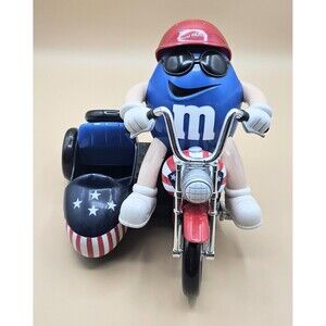 Rev up your collection with this rare M&Ms Blue Freedom Rider Candy Dispenser featuring a red, white, and blue patriotic theme! This fun and nostalgic piece showcases Blue M&M as a cool biker wearing sunglasses and a red helmet with an eagle decal, riding a classic chopper with a stars-and-stripes sidecar.