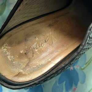 Woven leather black stacked heeled mule slides. Very soft leather in good condition no structural flaws upper leather is nice, insoles are a little worn mostly on the right shoe. The bottom soles are worn but not worn through, still pretty thick.