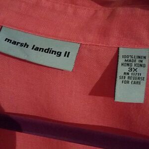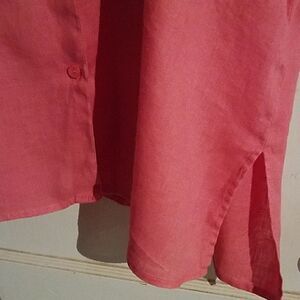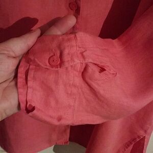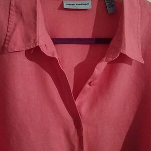 Salmon color, button up, long sleeve. Has slits on each side at bottom.