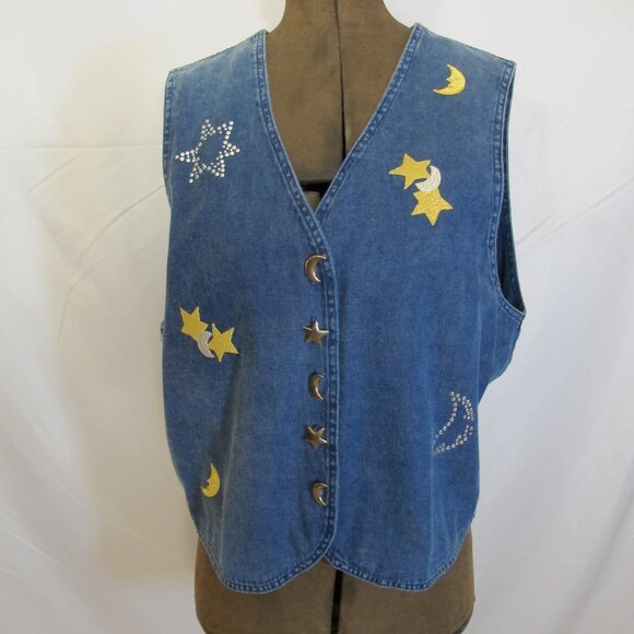 Marsha Sport denim vest with moon and star decoration. Decorations are applied sewn patches and silver studs. Button closure is alternating moons and stars. Gently used. Size XL PTP 22”, length 24”