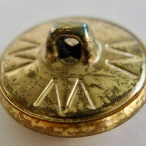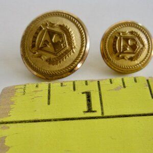 Waterbury gold tone metal button set features the iconic shield and laurel design. Shank back. Two front buttons, six cuff.