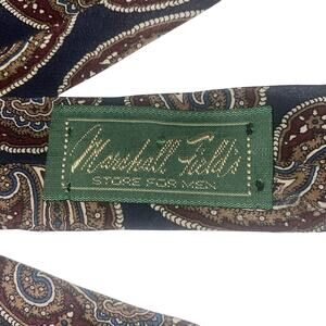 Elevate your wardrobe with this vintage Marshall Field's navy paisley tie. Made in the USA, this classic silk tie features a retro paisley pattern with the brand's logo accents. Perfect for grandpa, Easter, executive, paisley, vintage, dad, designer, retro, preppy, and classic themes.