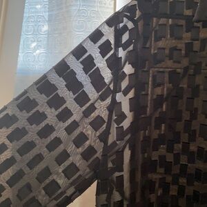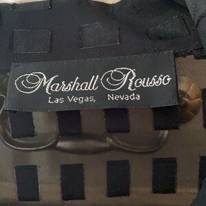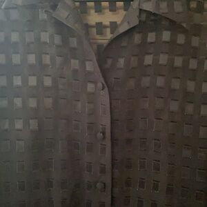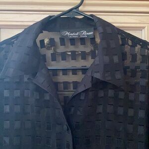 Marshall Rousso Las Vegas see through blouse. Beautiful! Black with square detail throughout top. See through so needs a cami, bra, or bralette under. Fictional button down the blouse and on sleeves. No side listed but I believe it’s a small or medium, style is to be worn a little over sized. Perfect condition