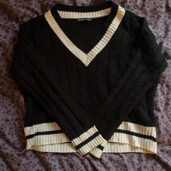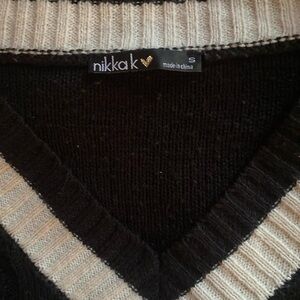 Chic black sweater with cream accents. V-neck design. Ideal for layering.