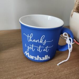 Vibrant blue mug with Marshalls logo. Ideal for hot beverages.